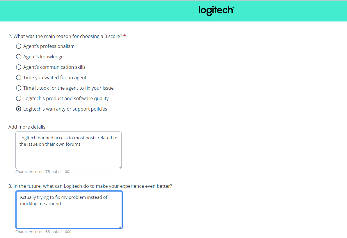 It's sad to see a really useful company like Logitech fall into the hands of idiots. I understand that perfection is hard to achieve but pretending your products have no flaws and making no effort to fix them is NOT the way forward. I will be thinking twice about buying your products in the future and if it weren't for the fact that there is almost no competition I would have consigned you to the bin already. This is a sad business all round. ![]()