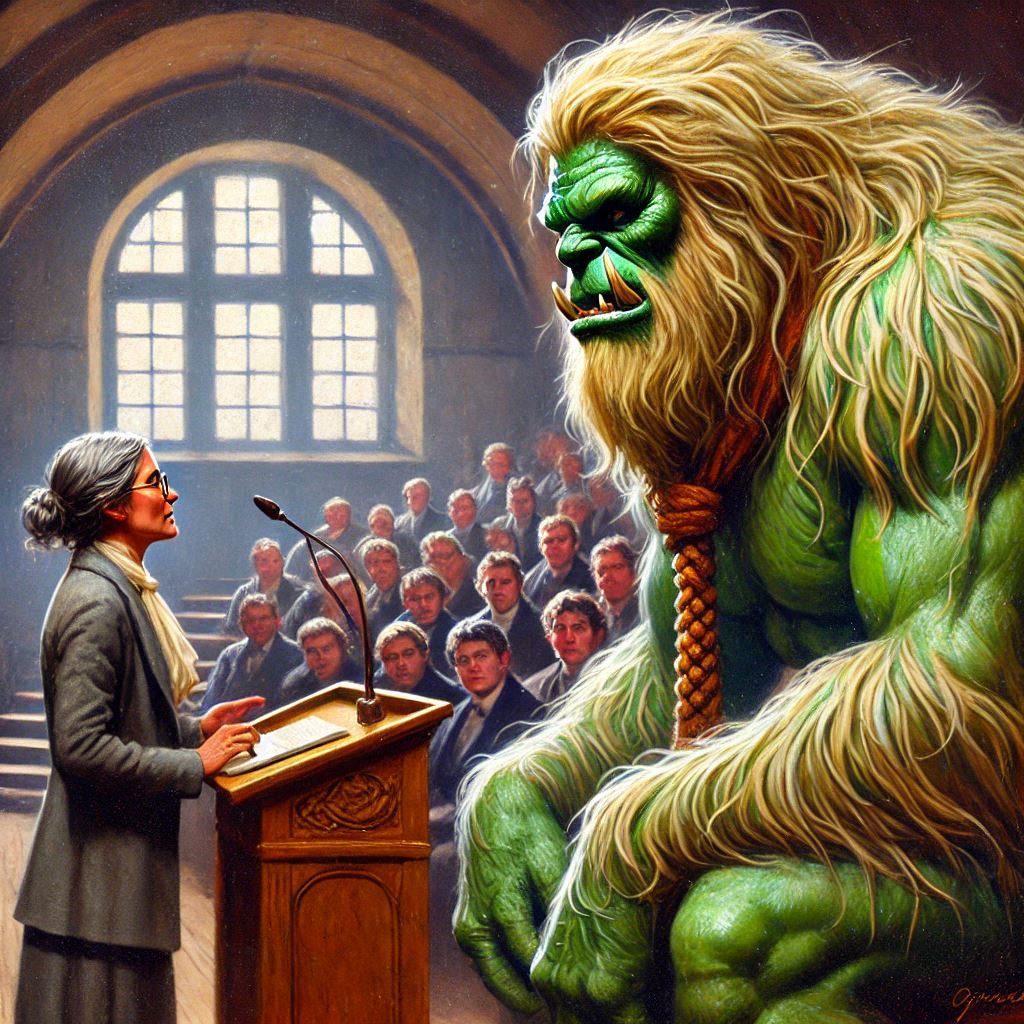 The headmistress takes on Grendel in front of the school. (click for full size)
